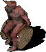 車椅子便器に座り、ねじれた2本の角と鋭い爪、牛の尾にあごヒゲを持った男神の姿で描かれます。